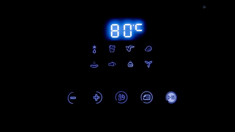 Fora os botões, a interface conta com 8 ícones de receitas pré-programados que são percorridos através do botão “Menu” e um display de sete segmentos com 4 dígitos para comunicar para o usuário o tempo, a temperatura, funções e erros.