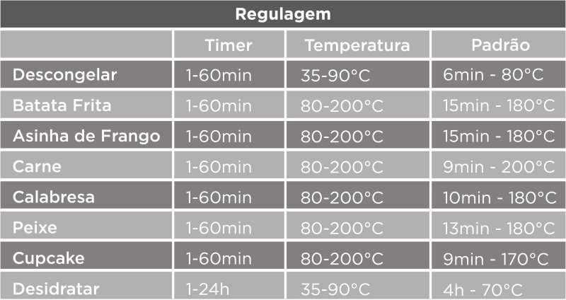 Cada função possui uma faixa de ajuste tanto na temperatura quanto no timer que podem ser feitas pelo consumidor. As funções Descongelar e Desidratar vão de 35-90°C e as outras funções de 80-200°C.