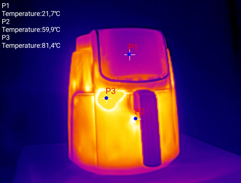Mesmo que o produto desligue a resistência e o ventilador sempre que é aberto, ainda sim todas as peças estarão quente. Por sinal, vale cuidar com alguns pontos da área externa que chegaram mais de 80°C. Essas números foram obtidos nos cantos superiores da porta, sendo o ponto mais alto o lado esquerdo.