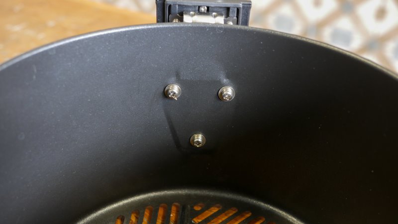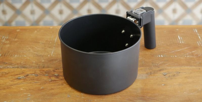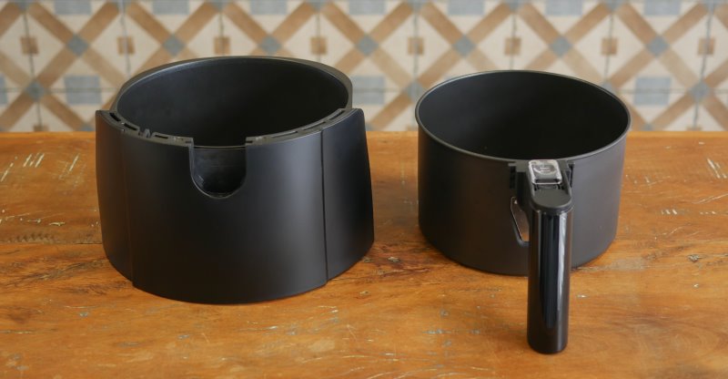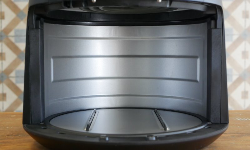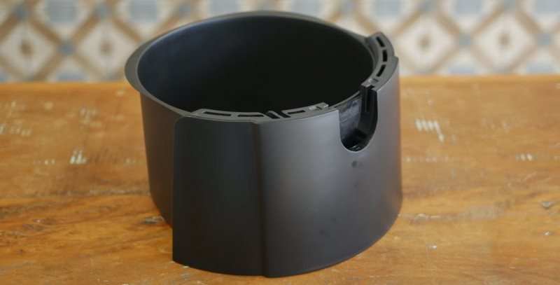 O coletor possui 4,9 litros com 21,7 cm de diâmetro. O cesto tem 3,7 litros até a boca, com 19,6 cm de diâmetro e 12,7 centímetros de altura. Não há indicação de máximo no cesto. É uma peça fundo quando comparado com a maioria das air fryers. Isso aumenta o volume declarado, mas diminui a área disponível para espalhar alimentos no cesto e garantir um bom fluxo de ar.