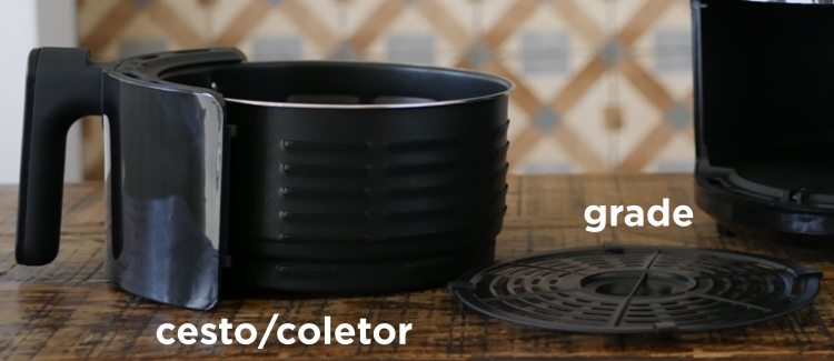 Para soltar a grade de dentro do cesto é chato. Há somente uma barra metálica no meio da grade, muito similar a air fryer da Semp. Junto com o produto não vem nenhum gancho ou utensílio para facilitar a remoção da peça. Assim que colocada só é para ser removida na limpeza. As borrachas dessa chapa metálica evitam o contato de metal com metal, mas se virar o cesto para remover os alimentos pode ser que junto venha a grade. Ela não fica bem travada no fundo.