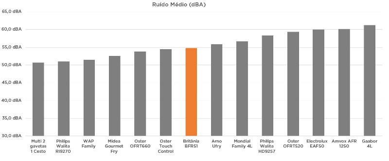 Na questão de ruído, a Britânia BFR51 está na média de barulho das air fryers já testadas. Com 55dBA não se destaca, mas também não faz feio.