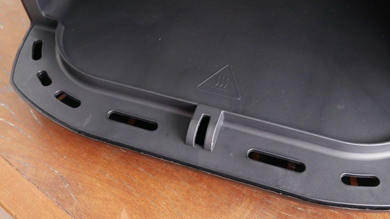 A cavidade interna é simples de limpar, não há cantos de acúmulo, exceto a borda que fica na saída da air fryer. A barreira ali é um ótimo acúmulo de sujeira e vai exigir uma escovinha para limpar.