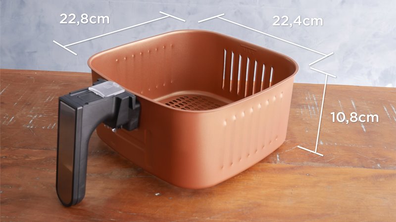 O cesto em si possui um antiaderente dourado. O aspecto visual ficou bom e o acabamento agradou. A Britânia colocou 3 pontos de apoio na peça , o cesto se mantém estável durante o manuseio. Foi algo importante, pois é uma peça grande, com mais de 22 centímetros de largura e comprimento, com quase 11 centímetros de altura.