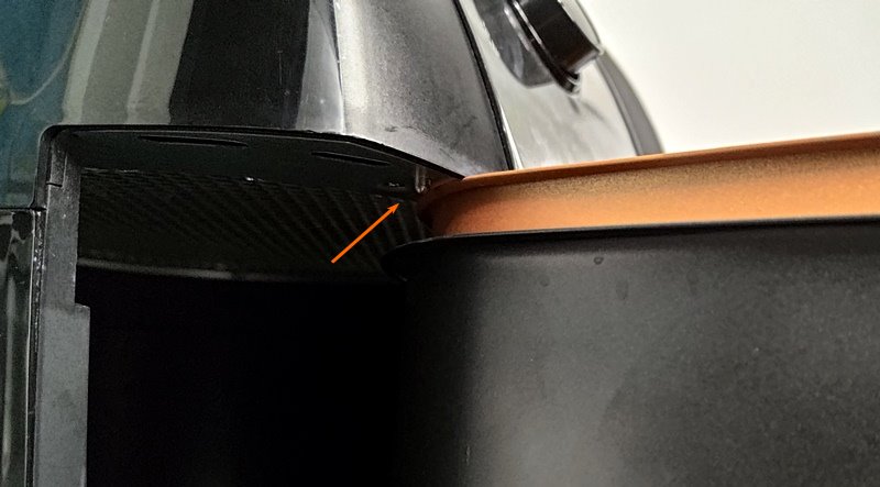 Quando encaixado, o coletor tem um pouco de jogo vertical e horizontal. Não chega a ser desconfortável, mas ao guardar o coletor vale assentar a base no corpo e então deslizar para dentro. Se não fizer isso há grandes chances de bater o cesto e riscar seu topo nas travas da porta da air fryer.