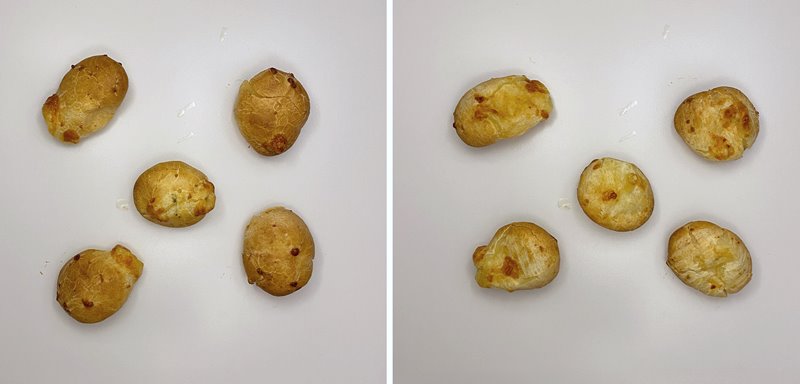 Quando testando pães de queijo, que são mais sensíveis à homogeneidade, em 180°C levou um pouco mais de tempo do que o esperado. Quando assaram, a parte de cima dos pães passou do ponto, e a parte de baixo ainda estava pálida.