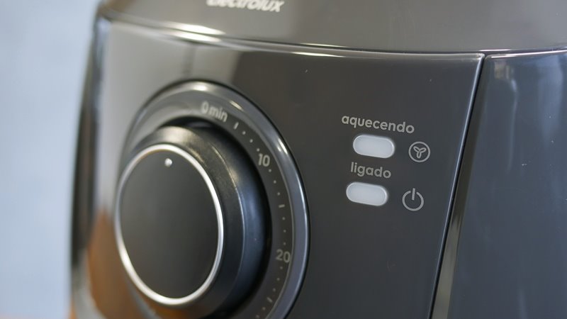 Ao lado do seletor há dois LEDs. Um indicar quando a unidade está aquecendo e outro quando a unidade está em funcionamento. A Electrolux deixou essa área com uma escrita bem clara, algo que poucas marcas fazem. A posição também ficou visualmente agradável.