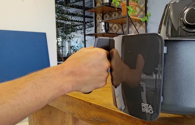 O pegador é de um plástico mais rígido que o corpo e com uma cor mais agradável. A empunhadura é boa, mas a porta da air fryer é gigante e pesada (1,58 kg). Devido a isso, dependendo de como se pega na alça, pode pesar no dedo que fica no topo.