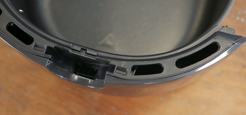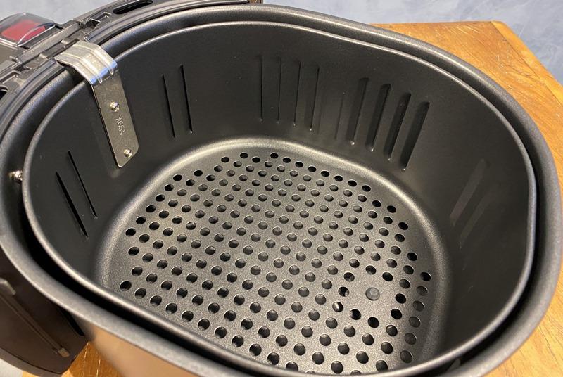 O cesto é comprido, com bordas curvas e laterais retas. O volume útil é grande, chegando a quase 5,2L! Uma das maiores já testadas. O antiaderente é bom, o mesmo material usado no coletor (dentro e fora).