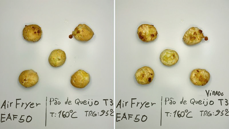 Quando preparando pães de queijo a velocidade de preparo foi boa, ficando abaixo de 10 minutos em 180°C e perto de 11 minutos em 160°C. Os pães mais perto das paredes escurecem nas bordas voltadas para elas. O resultado não foi ruim, entretanto seria melhor se a cor estivesse mais homogênea.