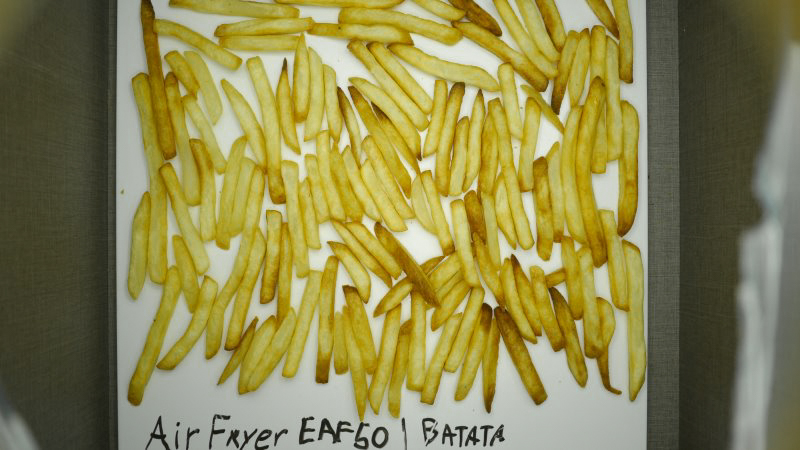 Os resultados com batatas fritas chamaram a atenção. A EAF50 entregou 400 gramas de batata em 13 minutos! Interrompemos na marca de 10 minutos para chacoalhar as batatas, mas devido a esse resultado, o ideal aqui seria ter parado ela para chacoalhar depois de uns 7 minutos.