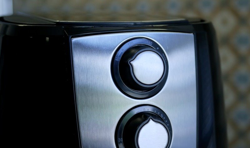 Os seletores ficam na frente com um um leve ângulo para cima, auxiliando o usuário que usa o conjunto em uma bancada. É prático de rotacionar as peças, assim como enxergar em que posição o seletor está. Somente seria mais agradável se a serigrafia do painel tivesse um pouco mais de contraste com o preto. Dependendo do ângulo ou luz no ambiente fica difícil de ver os números. O seletor de temperatura vai de 80 a 200°C e o seletor de tempo vai de 0 a 30 minutos.