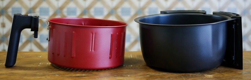 Algo que chamou a atenção é a cor do cesto, um vermelho bem diferente de qualquer parte do conjunto. Essa peça ficou agradável e chamativa em um produto basicamente inteiro preto. Imagino que na versão vermelha esse destaque diminui. O desenho em si do cesto é similar a vários modelos do mercado como a Oster com painel digital, a Philco Redstone ou a Britânia Pró Saúde.