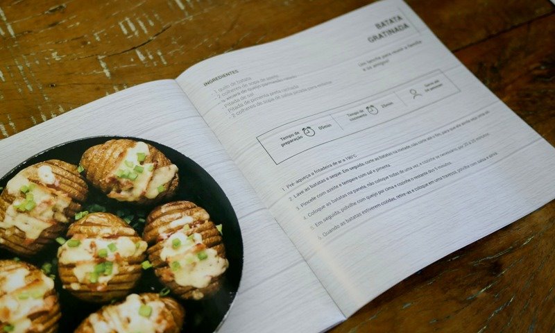 Esta Air Fryer conta com um livrinho de receitas impresso colorido. Simples, mas bem feito trazendo 7 receitas diferentes para auxiliar o usuário a entender melhor como preparar alimentos no produto.