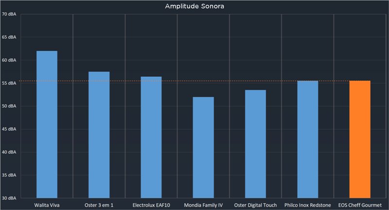 Em relação a ruído, o produto também ficou mediano. É mais ruidosa que algumas e menos barulhenta que várias, com um barulho em torno de 55 dBA.
