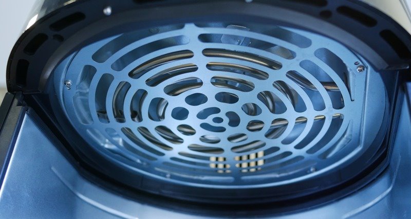 A área interna da air fryer é metálica sem pintura. É bom limpar assim que ocorram respingos de gordura no local, pois são áreas que mancham com facilidade. Não é um ponto muito exposto, mas como está próximo do coletor é fácil de acabar pingando algo ali.