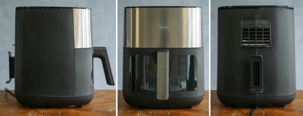 Na área externa é onde a Midea Smart Chef Pro está mais tradicional. Seu corpo é praticamente todo de plástico mole (polipropileno) em preto fosco.