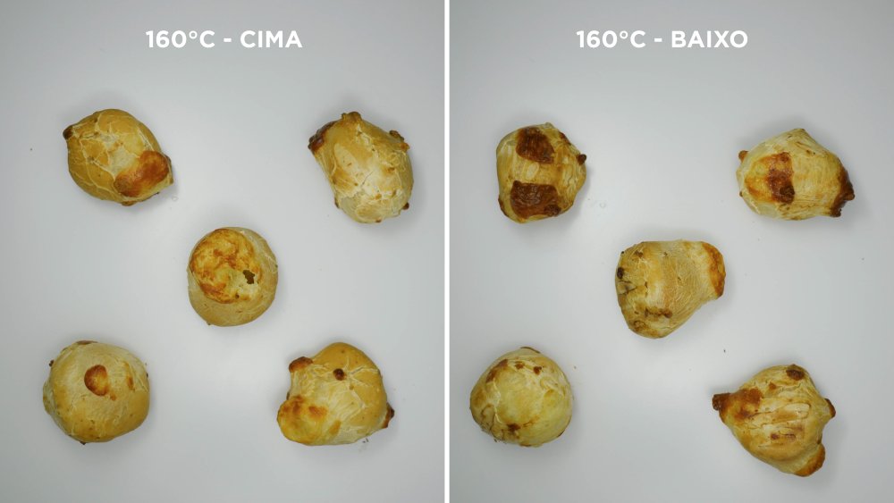 No preparo de pães de queijo o resultado ideal foi em 160°C, com mais de 20 minutos de preparo. O normal aqui é levemente acima de 10 minutos.