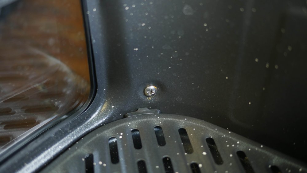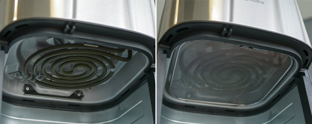 Esse local de resistência e ventoinha respinga muita coisa e abriga os pontos com os cantos mais inacessíveis. Tipicamente as air fryers ou não têm nenhuma proteção, ou tem uma grade mais aberta e que não pode ser removida, diferente daqui.