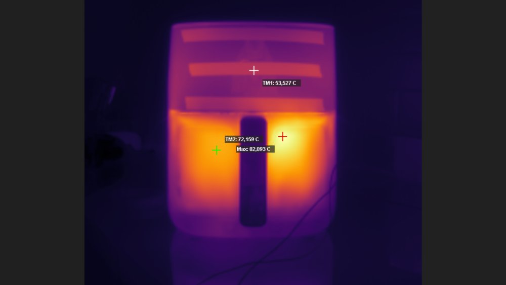 A air fryer Midea Smart Chef Pro não tem muitos pontos quentes na área externa, porém um deles merece um cuidado extra, pois fica na janela atrás do pegador. Ali medimos mais de 80°C, então vale um cuidado extra quando realizando a movimentação do coletor pela empunhadura.