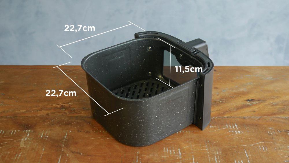 A Midea Smart Chef Pro é declarada com 6 Litros de capacidade, porém se considerar o volume útil, acima da grade até o topo do coletor, há basicamente 5,6 Litros.