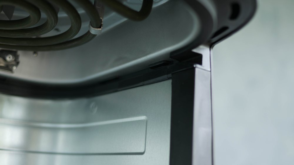 A cavidade interna é toda galvanizada. Aqui a grade poupa sujeiras na área superior, porém vale cuidar com todo o resto, principalmente evitar de chegar sujeira na parte de baixo da cavidade, onde fica a resistência. Essa área tem vários cantinhos chatos de limpar, quanto menos sujeira chegar ali, melhor.