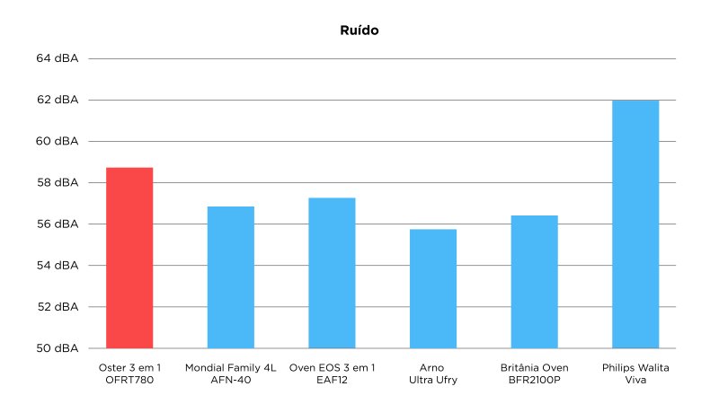 O ruído da Oster 3 em 1 está levemente acima de seus concorrentes com cara de forno. Não chega a ser mais barulhenta que a Air Fryer Viva da Philips Walita, mas não ganha por muito.