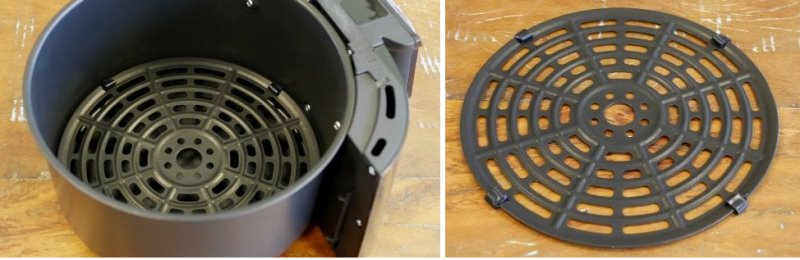 Esta air fryer não possui coletor e cesto separados. O coletor em si tem uma grade perto do fundo, separando o alimento da gordura que pinga no coletor. Não é o sistema mais prático, e nesse caso é ainda menos prático, já que a grade nem possui alça para ser levantada. Nos cantos há algumas borrachinhas que travam o prato no coletor. O acabamento do coletor é bom e o prato em si é razoável. Ambos possuem antiaderente de boa qualidade.