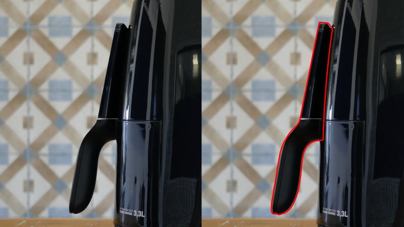 A área externa, toda lustrosa, risca com muita facilidade. É praticamente toda de polipropileno, um plástico mole. Assim mesmo, nada muda quando comparado com a maioria das air fryers do mercado que usam o mesmo material. Seria interessante se houvesse uma versão clara, a cor conseguiria esconder muito desses riscos.