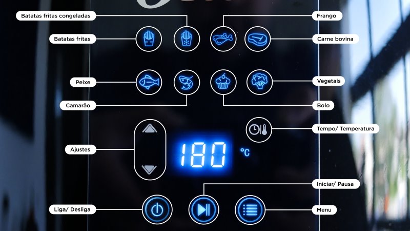 O demonstrativo de temperatura e tempo é um display de 7 segmentos com 3 caracteres em LEDs azuis. É simples, mas tem uma ótima visibilidade. É possível ajustar o tempo entre 1 e 60 minutos e a temperatura de 40°C a 200°C. Essa temperatura de 40°C é um diferencial para quem quer somente manter o alimento aquecido. Normalmente as air fryers tem uma temperatura mínima de 80°C.