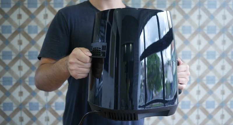 A Oster Touch Control ou OFRT950 é praticamente inteira em preto lustroso com um detalhe em preto fosco no topo. O acabamento do produto está acima da média, com poucas deformações no plástico e ótimo encontro entre as peças. Algo interessante deste modelo é que não há emenda no centro da air fryer, como é comum em grande parte dos modelos vendidos no mercado. Visualmente agrada mais, além de ser um ponto onde comumente há deformações no encontro das peças.
