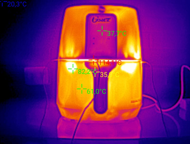 O cabo de alimentação poderia ser mais longo, aqui possui pouco mais de 85 centímetros. É importante que haja aterramento onde for utilizar a Oster Touch Control, pois há uma corrente de fuga considerável nas chapas metálicas internas do produto. Outro ponto importante para se atentar é com a temperatura externa da unidade. Atrás do pegador foi medido acima de 80 graus. É uma air fryer com temperatura externa acima da média