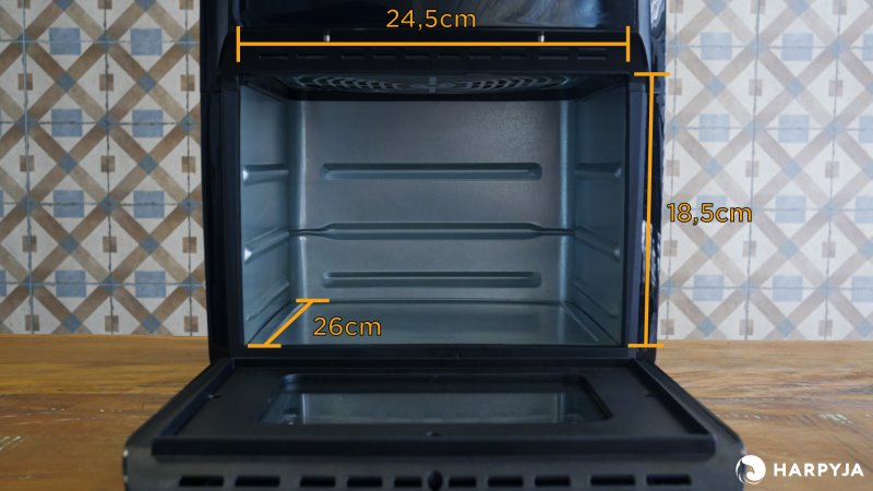 O volume total interno é quase 12 litros, medindo deu em 11,8L. O interior possui 18,5 centímetros de altura, 26 de largura e 24,5 de profundidade. Há 3 níveis, além de ser possível usar o fundo do forno, pois a resistência somente está presente no topo.