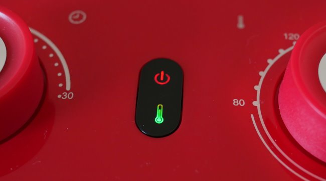No topo ficam os seletores e os indicadores de temperatura e funcionamento. O produto vale ficar em uma bancada abaixo de 1,2m para ver bem os seletores. O seletor de tempo vai de 0 a 30 minutos. Há dois indicadores discretos entre os dois seletores. Quando funcionando o LED de funcionamento vermelho fica aceso e quando a temperatura desejada é atingida o LED verde da temperatura acende.