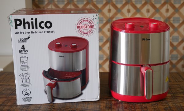 Algo importante ter em mente é que as imagens da caixa e dos sites está bem diferente do que o produto realmente é. O tom de cor do cesto redstone é próximo do bordô, um vermelho mais escuro. Até aí tudo OK, porém a cor do produto não chega próximo da cor do cesto. O produto é vermelhão. É uma pena, pois o vermelho do cesto é bonito, e seria interessante que a air fryer fosse dessa cor. Por outro lado, para aqueles que já tem eletroportáteis vermelho da Philco, não precisam se preocupar com diferença de tom.