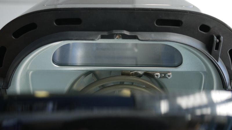 A cavidade interna é toda de aço galvanizado com quatro guias de nylon na base. Visualmente é mais atraente que a maioria das air fryers. Na parte superior interna está a resistência, ventilador, iluminação e a janela de vidro, que dá visibilidade interna. A iluminação é uma peça de padrão superior ao que já vimos, com um envólucro de vidro. A resistência e ventilador ficam mais para trás que usualmente, devido ao espaço necessário para a janela.