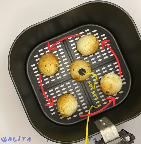 O efeito acaba sendo similar quando preparando pães de queijo. Em muitas air fryers o resultado é superior quando preparando em 180°C, mas aqui é melhor preparar em 160°C. Nessas condições o resultado foi bom, entregando os pães em torno de 12 minutos. As áreas mais expostas ao fluxo do vento ficaram consideravelmente mais douradas e o fundo ficou mais claro. Poderia ter tido uma homogeneidade melhor. Na imagem abaixo, as setas apontam a direação do vento.