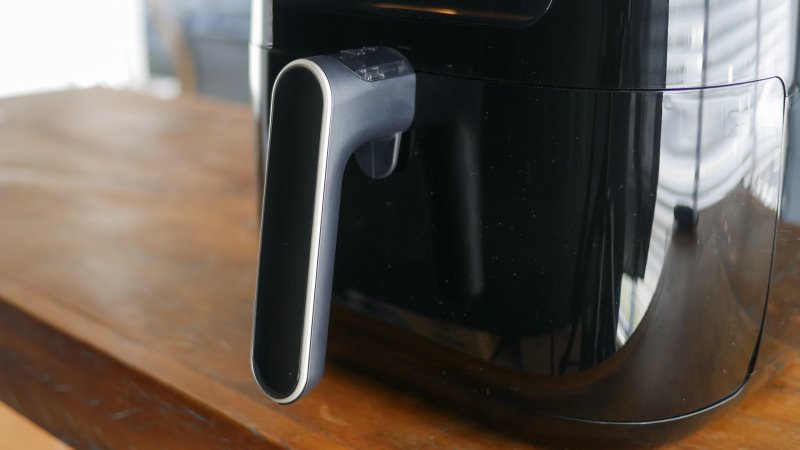 O corpo é todo curvo, com um aspecto cúbico e bem arredondado nas laterais. Harmoniza com o pegador também curvo na alça e nas extremidades. O detalhe metalizado no topo se repete na alça, quebrando o preto presente em todo o corpo. Assim como a maioria das air fryers do mercado, é quase toda de plástico mole (polipropileno), facilmente suscetível a riscos.