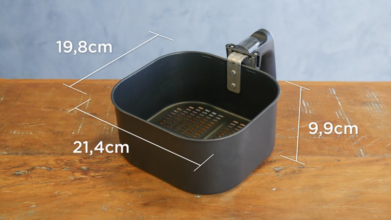 O cesto e coletor seguem o padrão da air fryer Philips Walita Ri9270, mas não são peças intercambiáveis. A Philips Walita faz a declaração do volume baseado no COLETOR. A unidade realmente tem o volume declarado (5,6 Litros), porém o que importa mesmo é o volume do cesto, que aqui deu 3,8 Litros. A altura do cesto é boa, levemente abaixo de 10 centímetros.