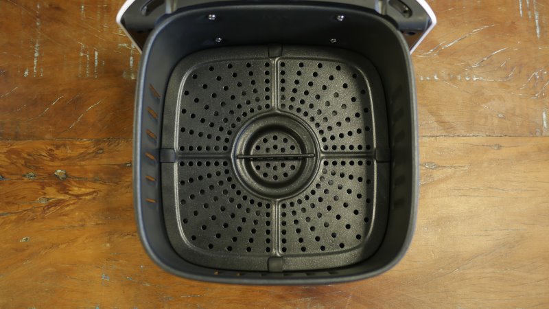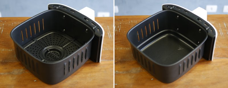 O cesto e o coletor possuem antiaderente. Infelizmente não há nada que chame a atenção dessa chapa perfurada em termos de usabilidade. Ela vem somente com uma barra no centro que serve como alça, nada prático para puxar.