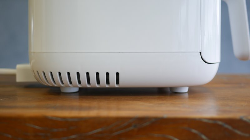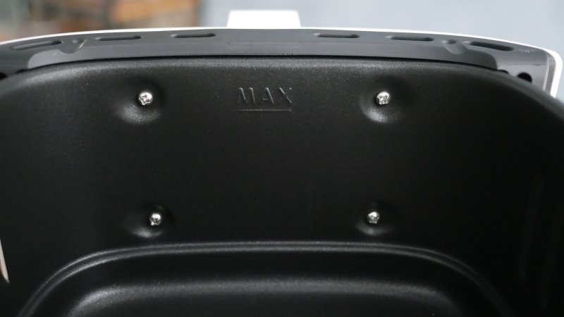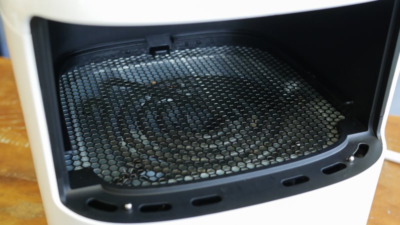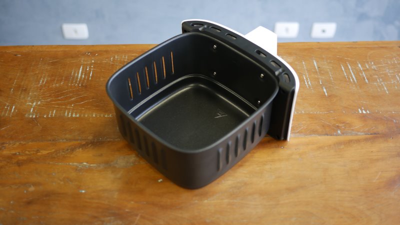 A configuração física da air fryer Xiaomi também não contribui para um fluxo de ar bem distribuído no cesto. A Xiaomi fez rasgos na lateral do produto, mas o ar não tem como vir pelas laterais e entrar por ali.