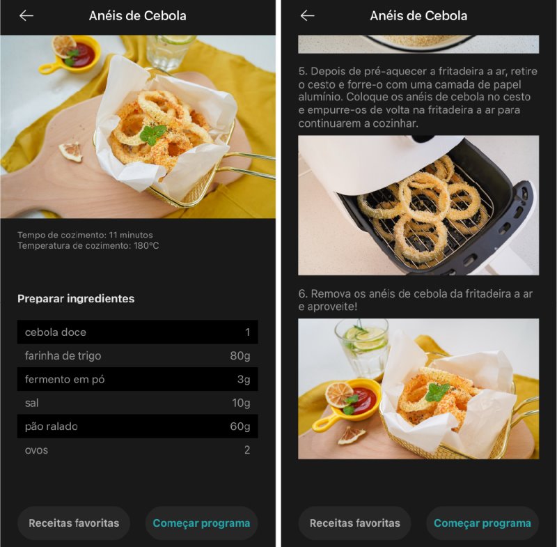 No aplicativo há cerca de 100 receitas diferentes com os detalhes de ingredientes, o meio de preparo e um botão que inicia o ciclo na air fryer já com a configuração para o preparo daquele prato. É algo simples, mas pode ser que agrade alguns.