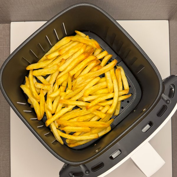 Com batatas fritas, a situação não foi favorecida pelo cesto pequeno. As batatas acabam se aglomerando umas sobre as outras e, mesmo mexendo as batatas, depois de 10 minutos a homogeneidade não foi boa e grande parte das batatas ficaram moles.