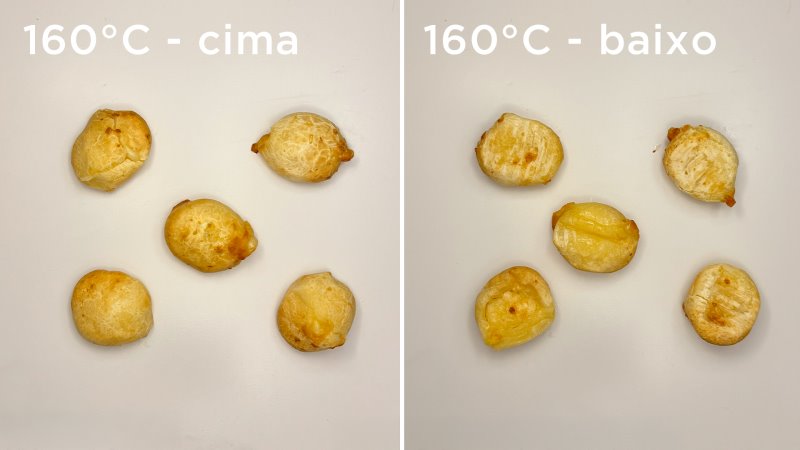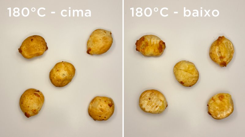 Preparando pães de queijo em 180°C, tostou muito mais no topo dos pães do que embaixo. Quando estavam prontos, não cresceram significativamente e acabaram murchando rapidamente também.