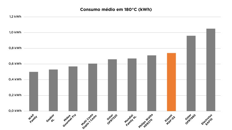 Na questão de consumo, principalmente considerando o volume pequeno da unidade ela consome acima da média. Comparando com a Philips Walita XL Ri9270 (de volume consideravelmente superior) esta air fryer Xiaomi ainda consome mais! Beirando 0,74kWh.