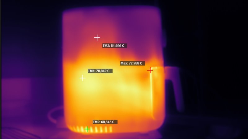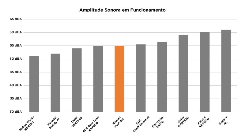 Se tratando de ruído, a MAF-02 ficou na média do ruído de air fryers, em torno de 55dBA. Particularmente achei o ruído mais incômodo que a maioria, possivelmente pelo som do vento passando pela chaminé.