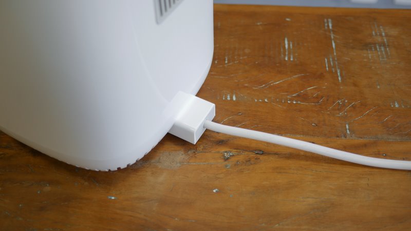 Na área traseira há um ressalto ao redor do cabo de alimentação, provavelmente para evitar que a chaminé seja bloqueada contra uma parede. O cabo de alimentação sai por trás com a mesma cor do produto. É um cabo grosso, de boa qualidade, mas pouco maleável.