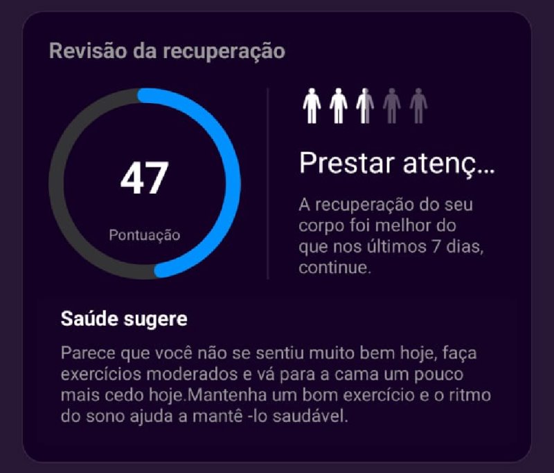 A página principal do aplicativo traz em destaque uma “Pontuação de Recuperação” que sumariza como está sua saúde baseada na sua atividade física, seu sono, sua frequência cardíaca, oxigenação do sangue e temperatura corporal.