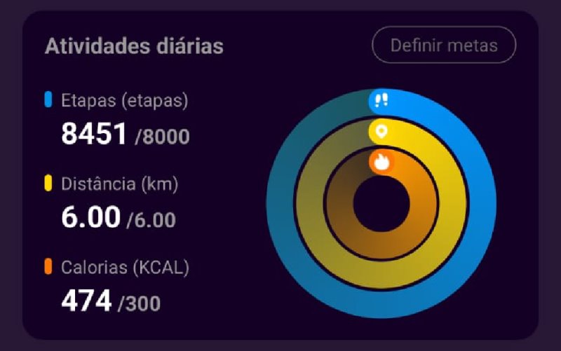Ali temos a contagem de passos do dia e uma conversão de distância e calorias. Em algum momento consegui chegar na tela de calibração de passos para quilômetros, mas nunca consegui chegar lá de volta. Caso alguém saiba, favor me contar como fez.