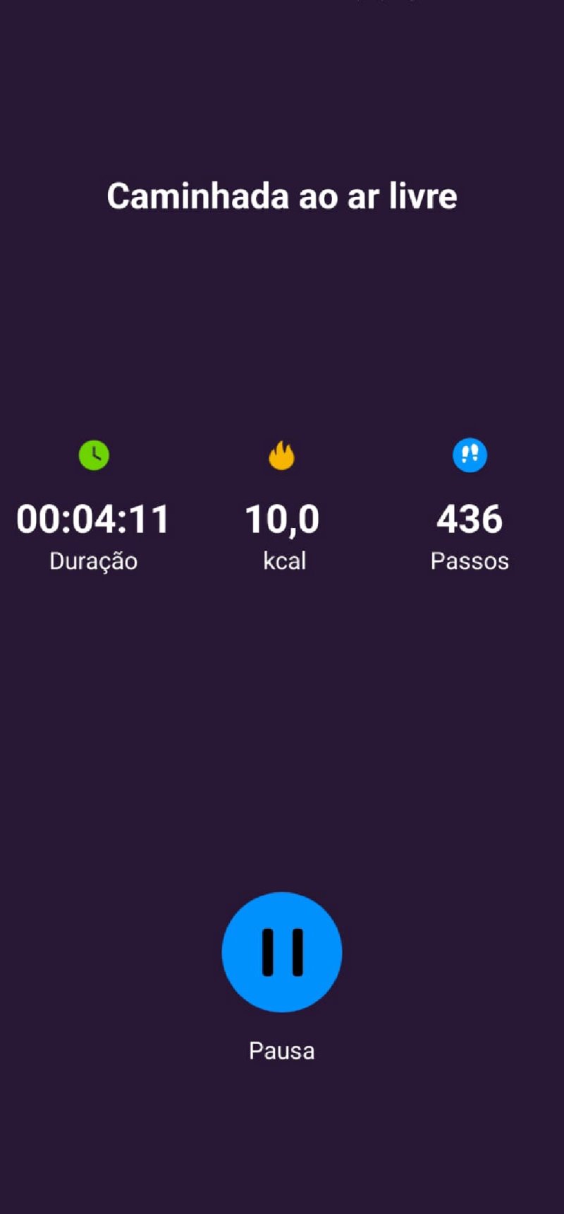Quando se ativa a execução de uma atividade física, o painel fica extremamente simplificado e não é possível mais navegar no aplicativo. Somente depois de parar que o acesso é liberado.